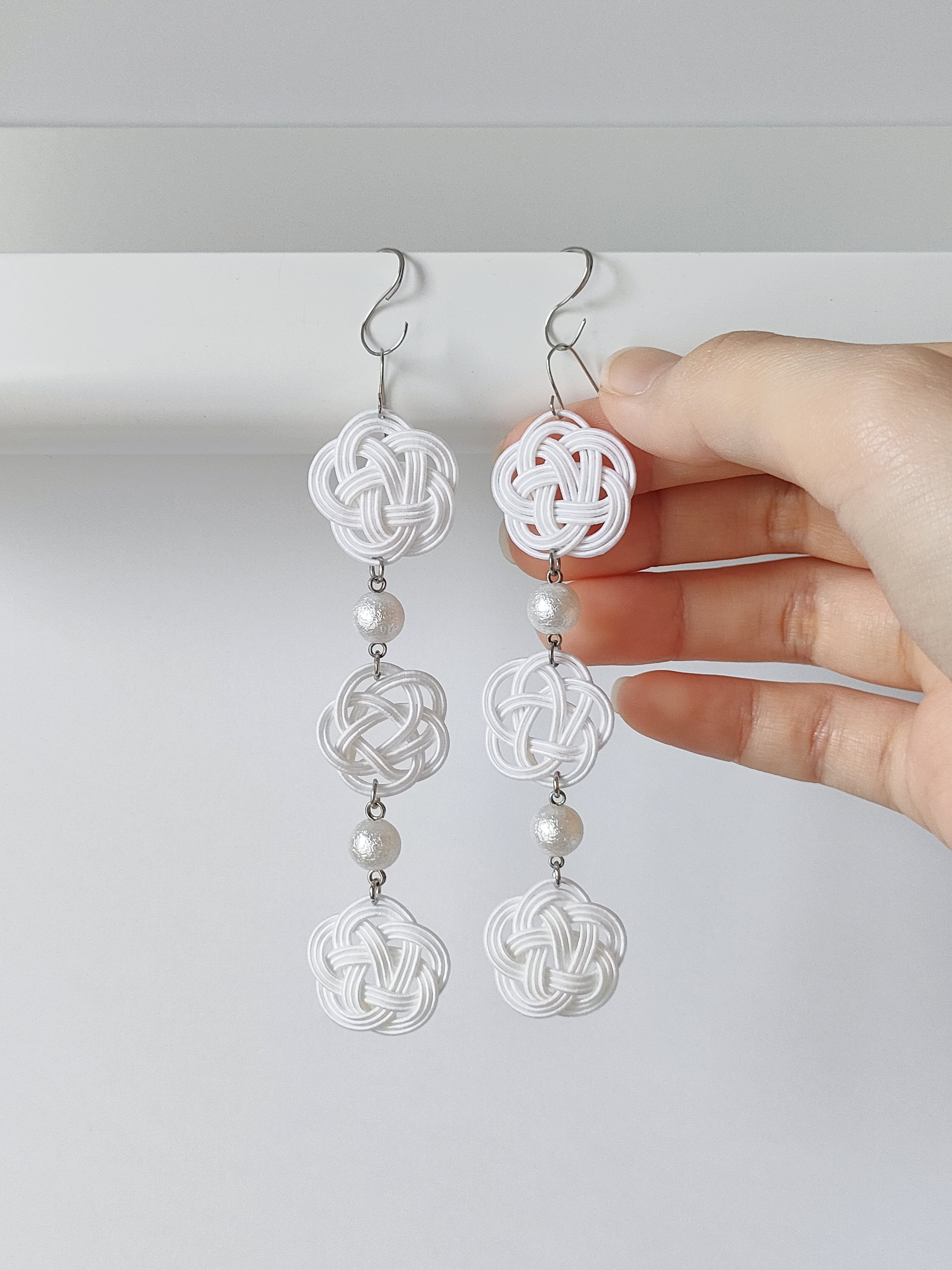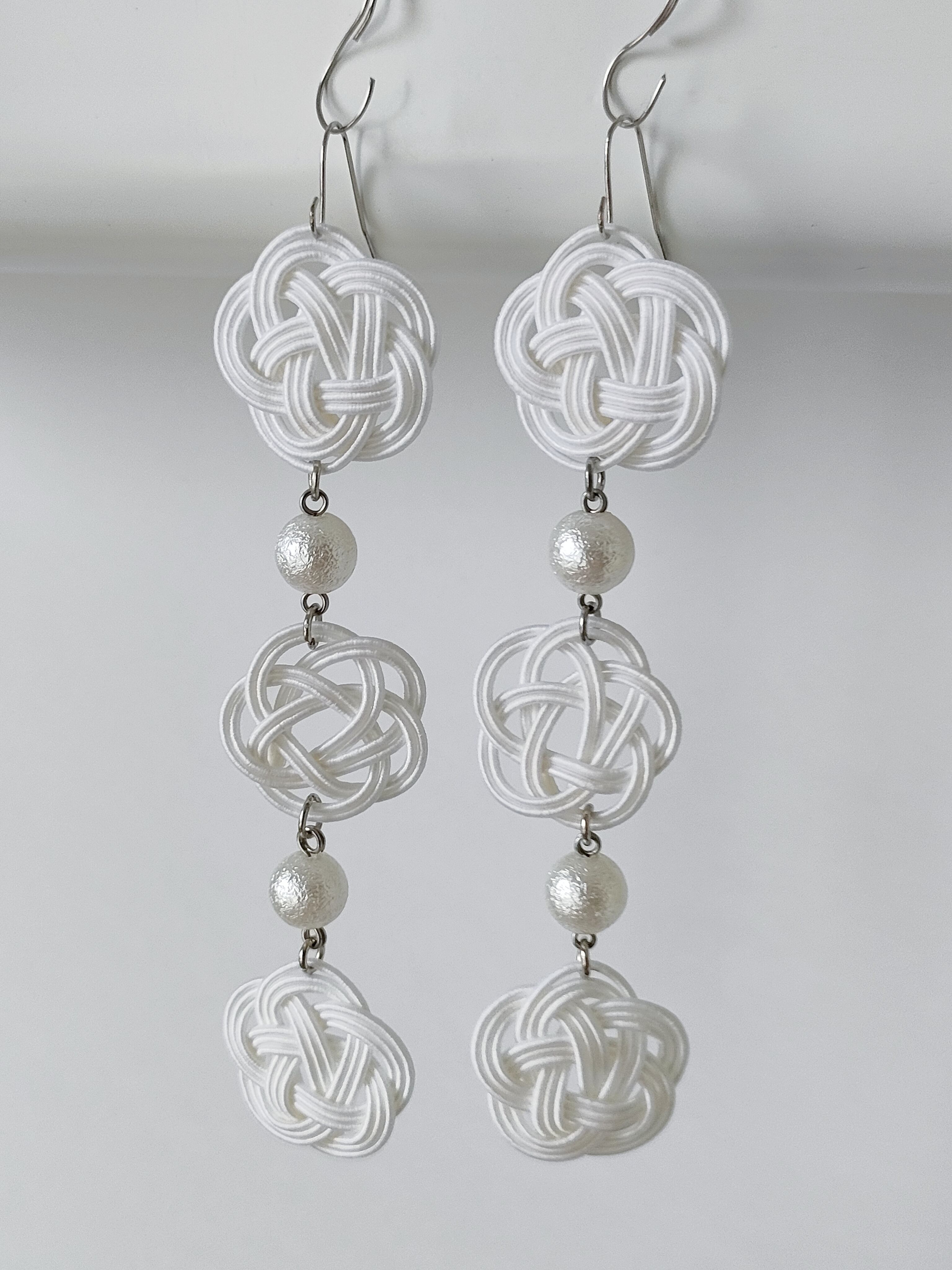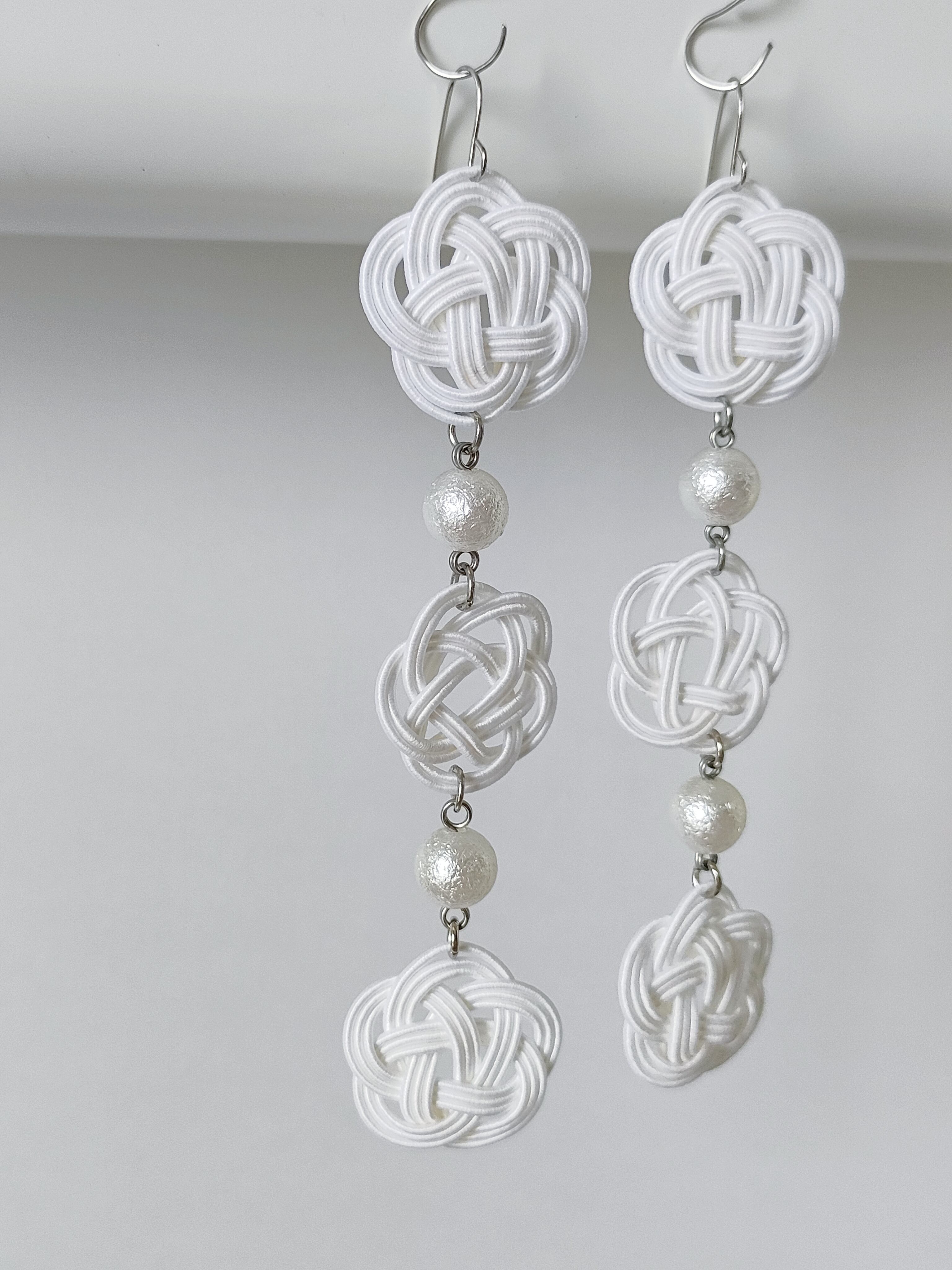 6つのお花モチーフの水引と光沢のあるパール風ビーズを組み合わせた、庭先で摘み取った花々をイメージした耳飾りです。